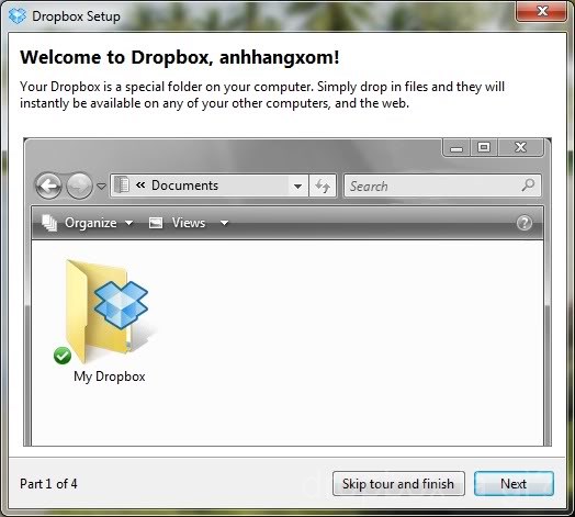 Vậy là xong, bạn làm tương tự trên các máy tính khác và mọi thứ sẽ được đồng bộ với nhau. Thời điểm viết bài này, tôi đã chụp hình minh hoạ trên một máy khác và thả vào Dropbox -> vài chục giây sau, máy-của-tui nhận được thông báo có 4 tập tin vừa được đồng bộ và tôi truy cập vào thư mục Dropbox trên máy để lấy file về. Giờ thì tôi biết vì sao người ta dùng Dropbox nhiều đến vậy. Gần đây trên mạng có rất nhiều thủ thuật liên quan đến Dropbox.