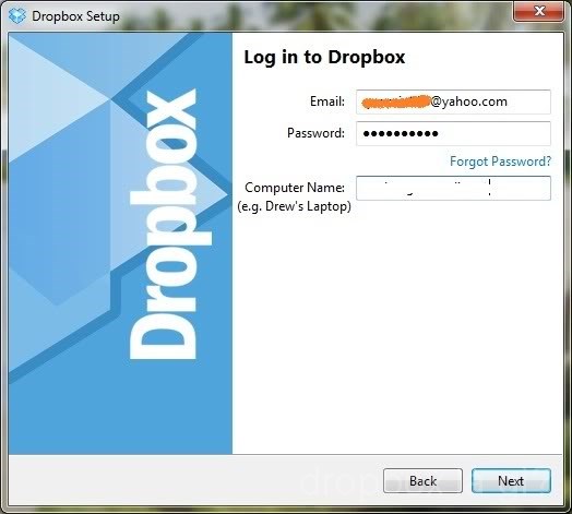 - Sau đó bạn nhập địa chỉ email đã đăng ký, mật khẩu và tên computer của bạn để đăng nhập Dropbox, bấm Next.