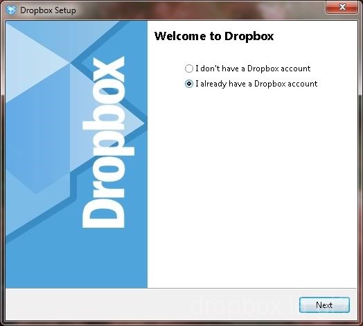 - Sau khi tải về bạn cài đặt như các phần mêm khác, đến khi hiện ra bảng Welcome to Dropbox như hình dưới bạn chọn “I already have a Dropbox account”, tức là bạn đã có một account Dropbox và bạn điền một tài khoản mà bạn đã đăng ky theo đường link bên trên vào. Điều này rất quan trọng, nó giúp cho tài khoản của bạn tăng lên thêm 250M và sau này có thể tăng đến 20G.