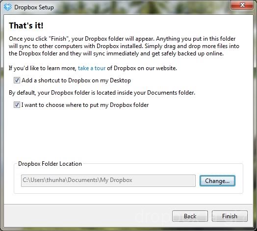 - Từ hình bên trên bạn chọn mục “I want to choose where to put my Dropbox folder” để chọn nơi bạn đặt thư mục Dropbox đồng bộ, tức là bạn sẽ “kéo” mọi tài liệu cần đồng bộ/sao lưu vào thư mục Dropbox này. Mặc định nó là thư mục “My Dropbox” trong My Document.